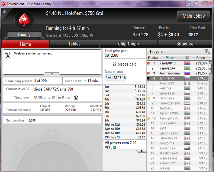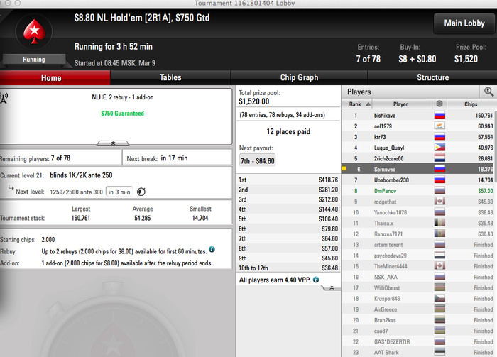 PokerStars - $8+$0.80|150/300 Ante 40 NL - Holdem - 9 playersHand converted by PokerTracker 4BB: 17,229 (VPIP: 27.40, PFR: 11.11, 3Bet Preflop: 3.85, Hands: 73)