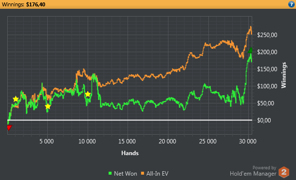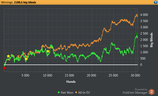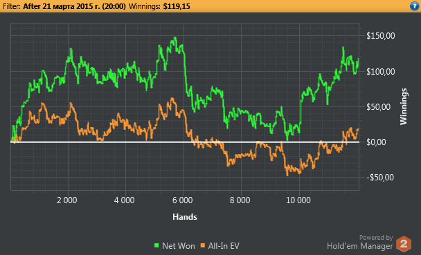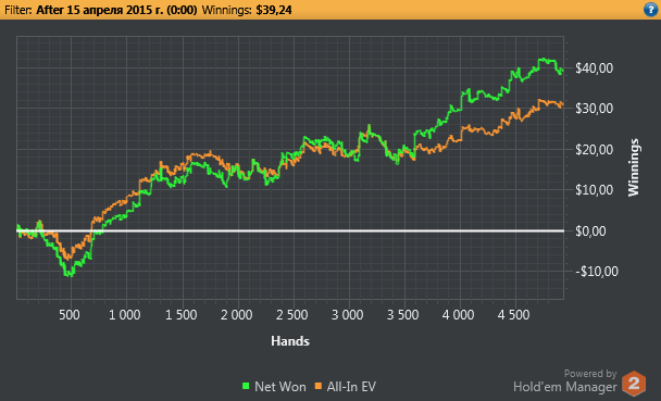 Начинал также бодро как и 1-ю, затем несколько сессий играл просто отвратительно. Последние 2 дня собрался и отыграл очень хорошо. По количеству рук опять провал, хотя здесь стоит отметить, что когда я начинал тильтовать, даже в начале сессии (середина графика), то сразу закрывал клиент на некоторое время и не играл. Раньше в таких ситуациях в тильте было залито не мало денег, сейчас же вроде справляюсь, и такой метод отдыха помогает)