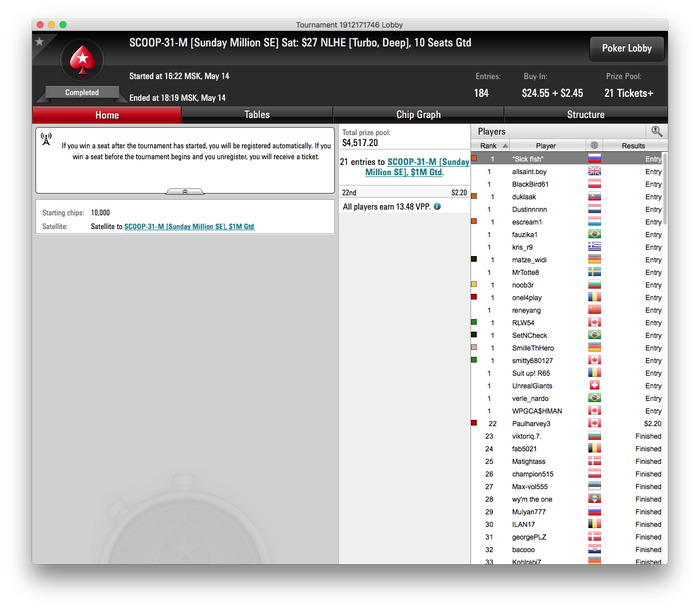 SCOOP-31-M $215 Sunday Million - выиграл сат. блины 250/500, стек 22М