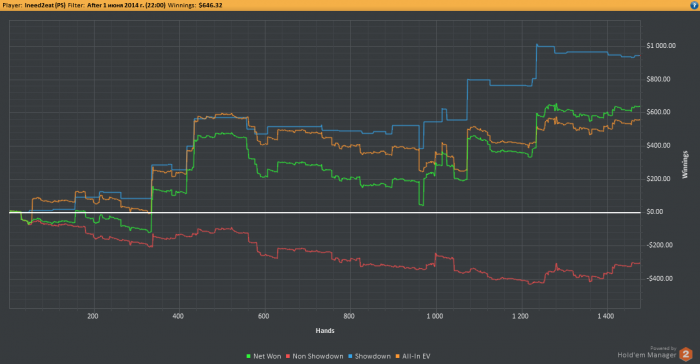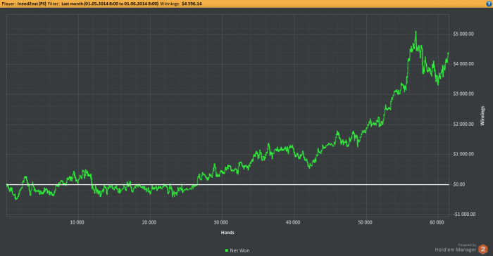 С начала месяца все еще был в поисках своей игры, и делал много херни, но потом вышел из ситуации пошел вверх. В прошлом месяце я откатал 10к рук, а на этот месяц ставилась цель откатать хотя бы 20 тысяч. В апреле я сделал депозит в 500$ (на нулевой счет), тогда я откатал тоже в районе 10к рук. и вроде бы все на нл50, но я уже не помню. Так что мне очень приятно осознавать что мой бр увеличился почти в 15 раз за "месяц с хвостиком") Судя по всему на графике не хватает еще несколько к рук с начала месяца. Но в целом картина по профиту не должна измениться.