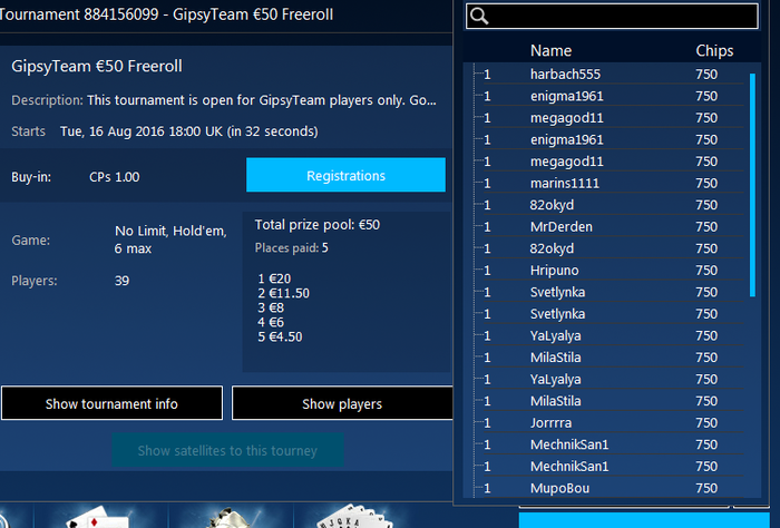 Всем привет , подскажите не могу найти фриролл на POKERDOM от GipsyTeam который по вторникам??