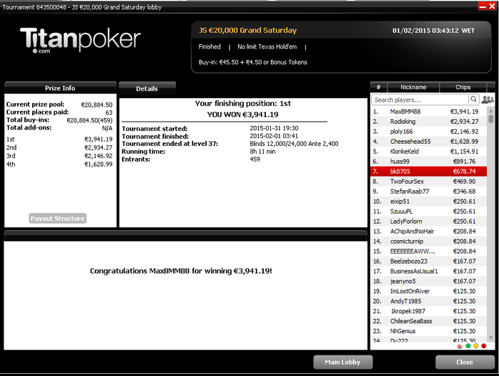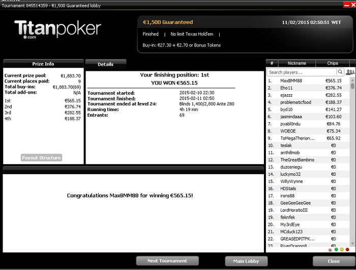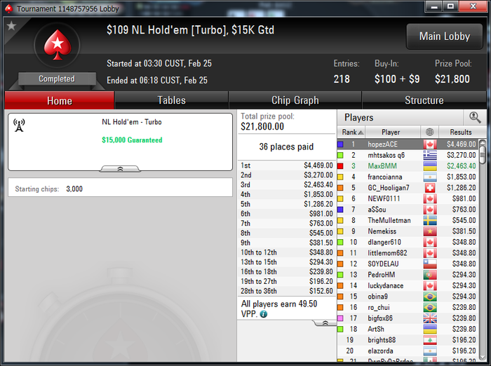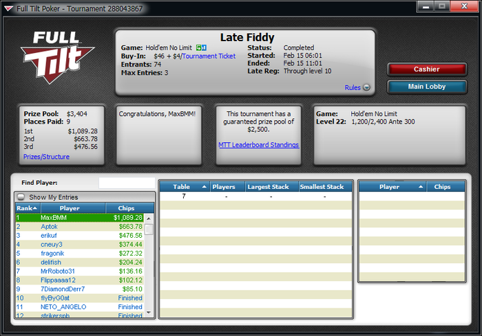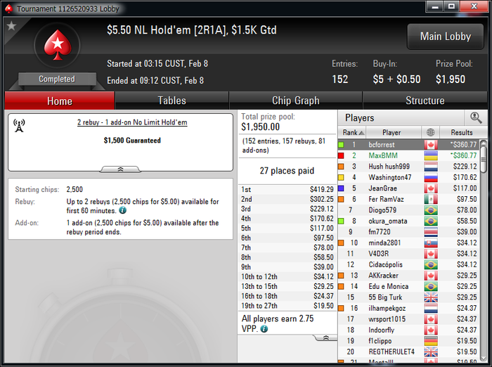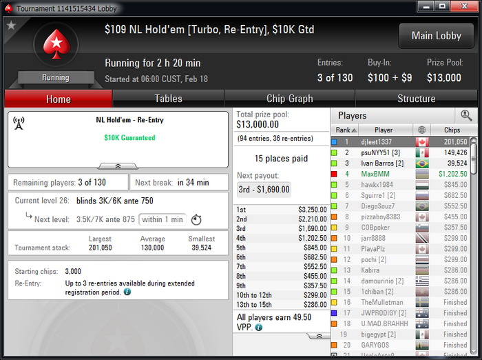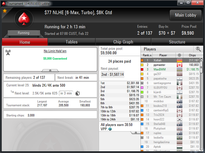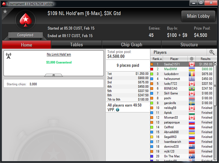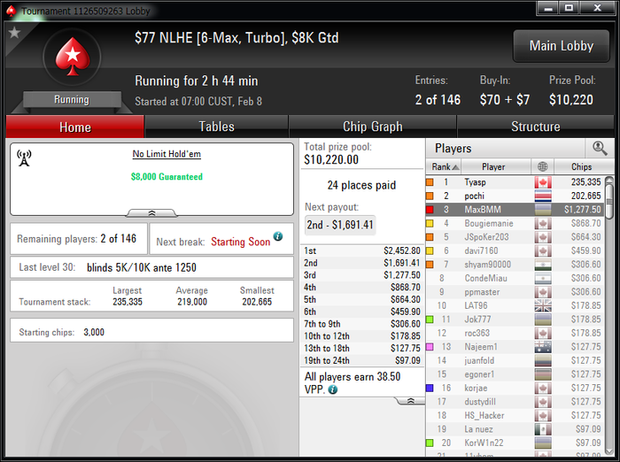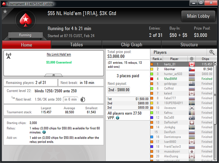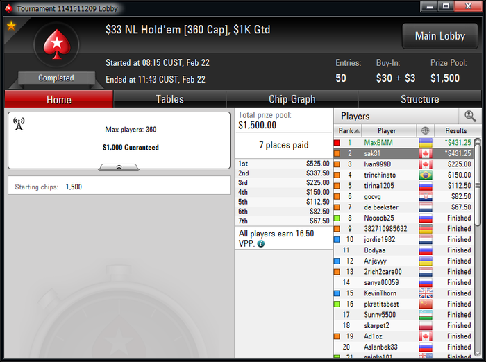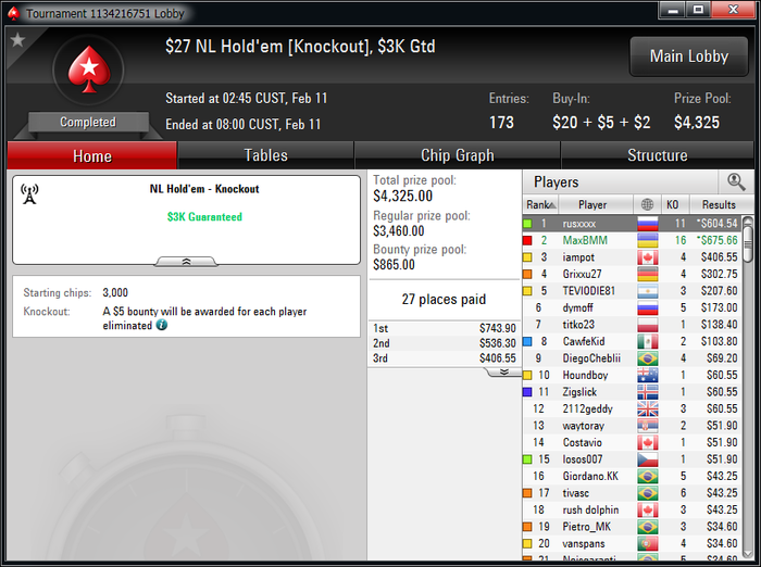 За 2 недели уже окончательно привык к ночной катке, откатал больше 450 туров в этом месяце,что очень много для меня за полмесяца. Плохо только,что рано вставать приходится,чтобы цеплять побольше хороших турниров.Ночью загрузка получается побольше, чем днем. Днем больше 2к не вгрузить никак, а ночью можно и больше 3к,если постараться.Уже больше трех недель заблокирован на 888(надеюсь временно,как никак мой самый плюсовый рум