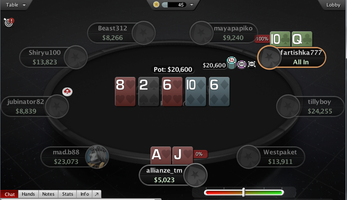На реке выходит 9. Ну тут у меня полный дом, причем почти ореховый. Оппонент даёт мне право действия. Хаха, надеется что я проверю сзади. Не тут-то было. Я ставлю полгоршка, он зовет и у него оказывается всего лишь AQ неудовлетворённые.