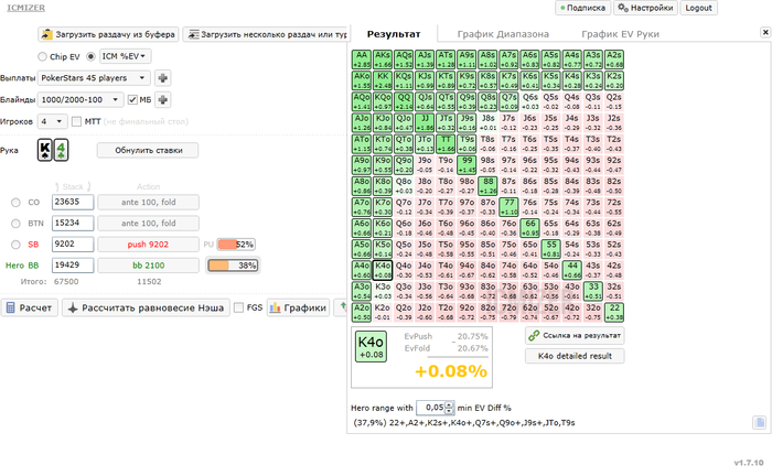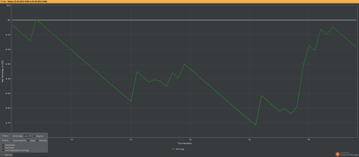 Сыграно: 56 турниров Общий прогресс: 90 турниров из 1500(6%) Утренняя сессия была минусовая. Вечером немного отыгрался, но недобрал баксов 20 точно. Были ошибки на финалках. Вот насмотрелся я стримов от базика в свое время, а на пользу мне это явно не пошло. Ситуация такая: Осталось 4 игрока. У меня стэк 30bb, у остальных 8-12bb. Я вспомнил слова базика: "пушим, так как их эффективный стэк слишком маленький". Ну и стал пихать то что пихал бы при стэке 8-12bb. Вылетел 4м Если бы просто сидел и ждал пока они друг в друга запихнутся, то 2max точно бы себе обеспечил.