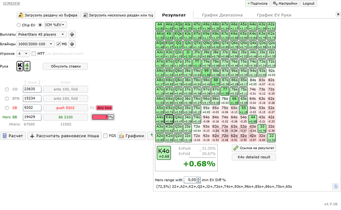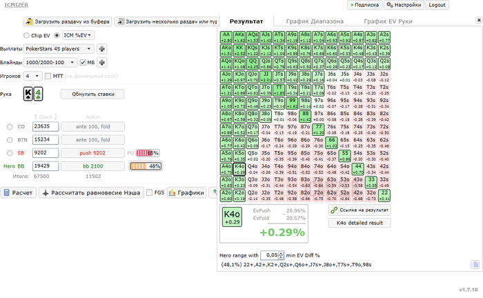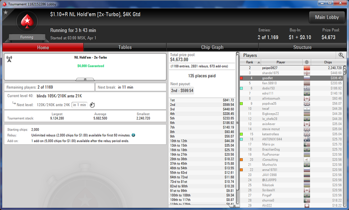 Апрель начался удачно) Вечером подгрузил пару дешевых MTTшек для разнообразия: Проиграл A4s<KJ. Опп рег-чипак, пушил с BU, я на SB. Думаю уравнял правильно, учитывая что блайнды были 105/210k, а мой стек 2M. Доволен результатом, ведь теперь БР точно хватит чтобы нормально катать 3,5$ 45max)