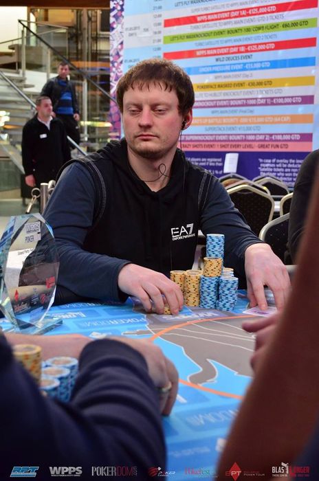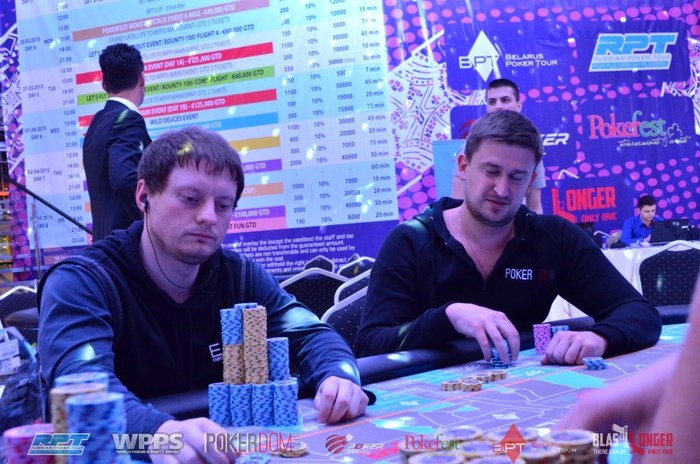 WPPS HEAD’S UP KNOCKOUT BATTLE €1000. Стек 15.000, уровни по 15 минут. Хедзап турнир с баунти, за каждого выбитого игрока - €500, игра до одной победы. Сейчас ведутся две дуели - Сергей Чудопал VS Алексей Романов и Дмитрий Похабов VS Рето Лочер.