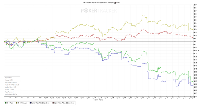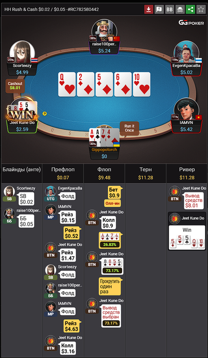 На пл5 5 карт не вывожу,особенно против Мантры,хорошо он меня потрепал да и в целом 5 карт я играю слабо,решил что буду тренить ходить на пл2 чаще и вот сегодня ночью подгончик,пока не на 5м или 10м лимите,но приятно.В целом,несмотря на то что появился банкролл,я пока не вытягиваю ни пл5 раш ни пл5 5карт,какой то винрейт есть только на рег столах в 4х картах и все.Правда сейчас уже самочувствие так себе,надо голодать,нет сил на гонки и часто вырубают свет,поэтому решил вначале голод а потом буду делать попытки бороться за лидерборды в раше.Ну а пока такой удачный заход в 5карт произошел.Еще один джек потик в копилку:)