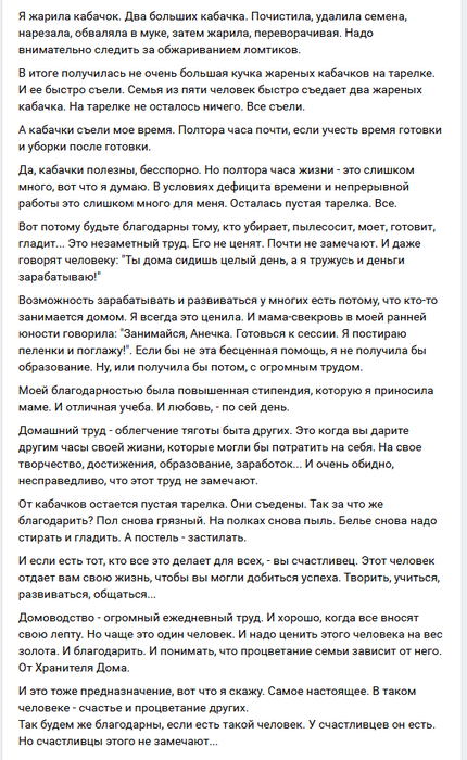 Классный пост.Сам раньше не замечал и не придавал значения,какую огромную работу делала мама всю жизнь,пока я был занят своими делами а батя своими.
