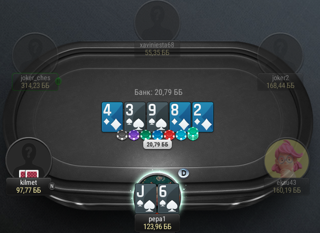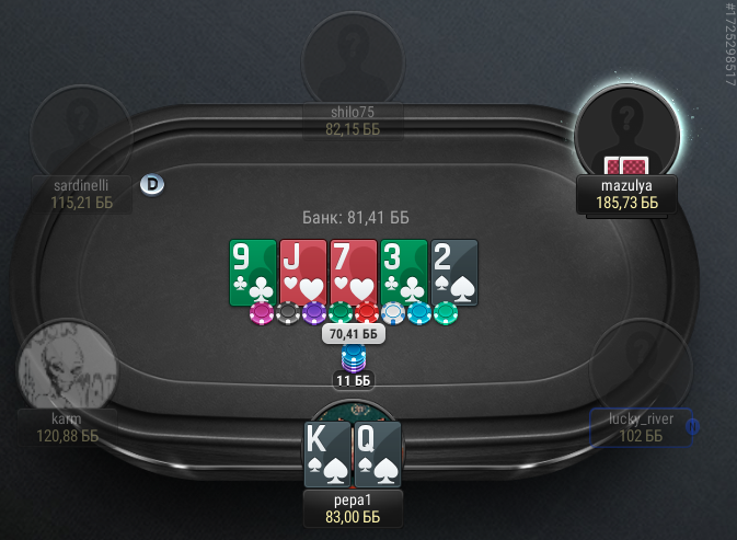 Чел на СБ заколдколил префлоп и на флопе отколол овербет в 140%. Дальше я зассала и все улицы чекала. Но его рука меня просто убила