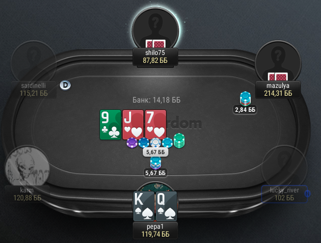 Я открылась, чуваки заколдколили префлоп. На флопе прилетел донк в 1/2 пота. я решила порейзить с гатшотом. Чел заколил.