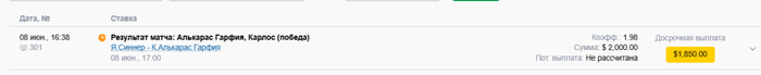 ПОСТАВИЛ $2.000 на победу Алькараса Потенциальный выход = $3960