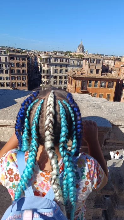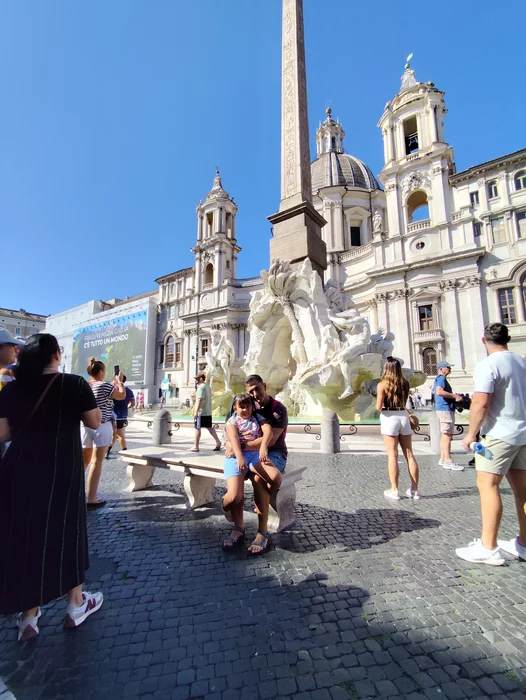 Следующей точкой стала площадь Пьяцца-Навона. Огромная и широкая, с тремя фонтанами. Самый известный из них — фонтан Четырёх рек, где каждая фигура символизирует одну из великих рек четырёх континентов: Нил, Дунай, Ганг и Ла-Плату. Вытянутая форма площади — это наследие античности: здесь раньше был стадион Домициана, и очертания арены до сих пор угадываются. Вдоль площади тянется церковь Сант-Аньезе-ин-Агоне, а вокруг — миллион кафешек. К этому моменту у нас на шагомере уже было больше 7000 шагов, и дочка выдала классическую фразу дня: «Хватит ваших фонтанов и колонн!» Короче, ей это всё уже было нафиг не надо, гораздо интереснее было бы созвониться с подружкой. Пришлось сдаться, присесть и выпить кофе/сок (кстати ананас, сок который любит моя дочь, на итальянском так и будет ananas).
