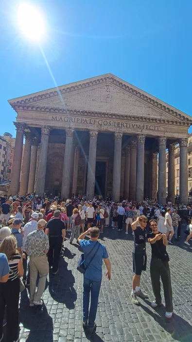 До Пантеона дошли, но внутрь попасть не получилось: очередь тянулась метров на 200 под палящим солнцем. В итоге ограничились видом снаружи. Хотя само здание впечатляет. Построено во II веке нашей эры, а его купол — диаметр 43 метра без всякого металла! — до сих пор считается инженерным чудом. В центре купола «окулюс», отверстие, через которое внутрь падает свет и даже дождь.