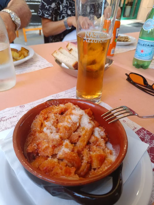 А на второе — trippa alla romana. Это рубец (то есть нарезанный говяжий желудок) в томатном соусе с мятой и посыпанный пекорино. Я сразу понимал, на что иду — заранее перевёл слово «trippa» и уже предвзято настроился, что будет так себе. И первые пару ложек действительно были странными. Но потом распробовал, особенно с хлебушком, и пошло как по маслу. Под пивасик так вообще отлично зашло.
