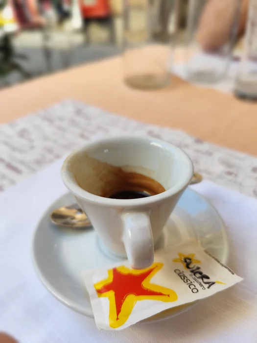 Напиток, кстати, я поменял на пиво вместо вина или воды. А в конце принесли кофе — в итальянском стиле: не чашка, а «наперсток». Дескофинадо здесь, в отличие от Аликанте, вообще не знают — на тебя смотрят, как будто ты просишь что-то инопланетное. Но сам кофе оказался реально вкусным, ароматным, даже в такой микродозе.