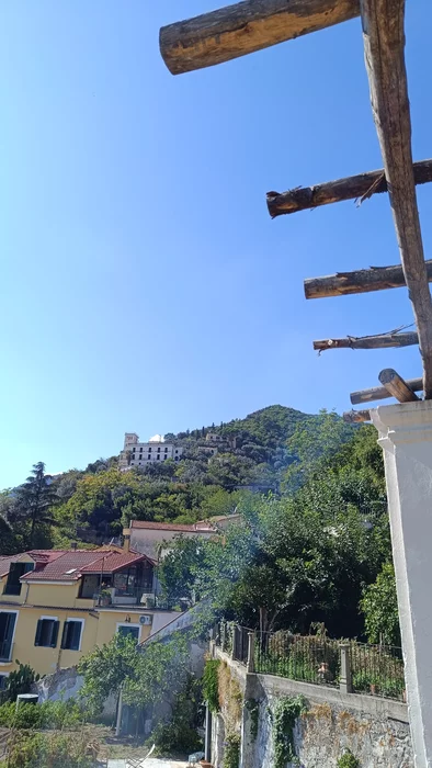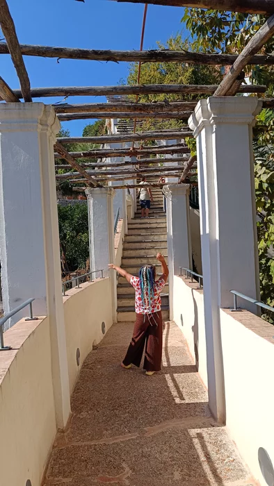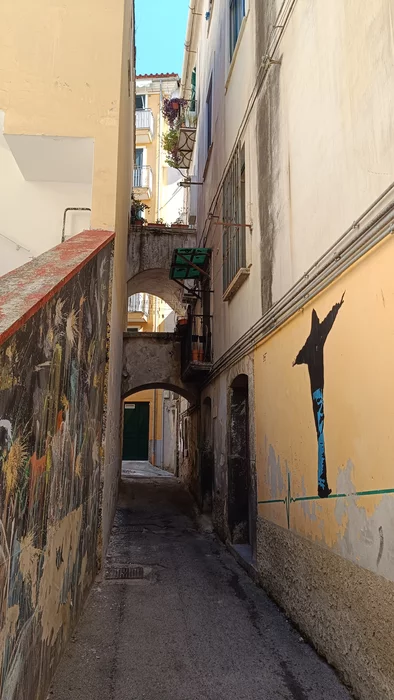 До самого сада добираться пришлось пешком через старый район из-за перекрытого города для праздника. Идёшь – и реально будто в мультике «Лука»: узенькие улочки, лестницы, мопеды, которые то и дело пролетают, кафешки, фонтанчики. Но одновременно всё это перемешивается с современностью: вот табличка в честь хирурга Саверио Авения, жившего более 100 лет назад, а через неё проходят современные кабели.