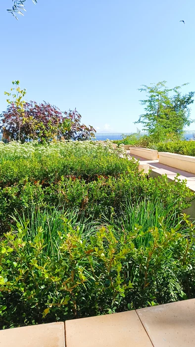 Сам сад оказался небольшим, вход – 6 евро с взрослого, детей пускают за 2, но Оксану бесплатно пропустили почему-то. При входе – кафешечка. Кофе там не подают – только чаи из местных трав, это их фишка. Мы взяли чай и посидели на террасе – красиво, зелень, виды, и сразу чувствуешь атмосферу.