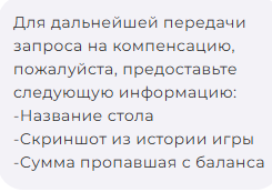 Отлично пообщался в чате, великолепно провел воскресный вечер, скришотя столы, с раздачами где все видно но все равно, нужно написать названия стола ручками, и сумму пропажи, но на том же скриншоте видно какая сумма была за столом в последний раздаче, перед тем как стол закрылся, а какая точная сумма не вернулась я не знаю, что за бред.