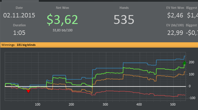 Допустим я играю 12 столов нл10 в 5бб/100. За час игры, я наигрываю 1000 рук, что при моем винрейте - 5 долларов в час.+ РБ. Играя 4 стола, допустим я буду иметь винрейт 7-8бб/100, или же 7-8$ за 1к рук, но для того что бы наиграть 1к рук, мне понадобится 3 часа, а следовательно моя почасовка, будет - немногим больше 2.5$/час. Улавливаешь разницу? Чтобы выйти на свои 5$/час, мне нужно играть в 15бб на сто, что конечно же возможно, но чем выше лимит, тем сложней будет этого добиться.