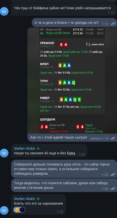 На самом деле, картина сложнее, так как учитываются сразу все возможные сценарии, таким образом, например, выходит, что нам “нужны” какие-то масти, скажем, для блеф рейза ривера, когда наше дро не закрылось, но мы имеем хорошие блокеры, в то время как без масти делать это было бы сильно хуже. И так по всем линиям и возможным сценариям - что-то где-то зачем-то оказывается нужно. Однако, это только потому, что с той стороны баланс. В игре людей, если ты хорошо понимаешь доски, комбинаторику и тип оппа, чтобы, например, блеф-рейзить риверы тебе не нужен блокер, да и рука как таковая из-за слишком большой уязвимости страты оппа, либо же, напротив, любой блокер не сработает из-за неуязвимости страты оппа (так красиво я назвал отсутствие блефов у нита).