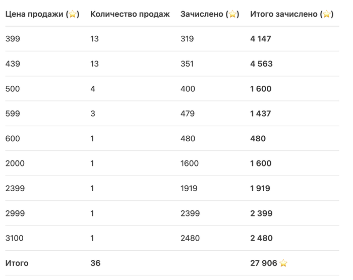 ➔ ROI = 244.5% (т.е. каждый вложенный "звёздный" рубль принес 2.44⭐️ прибыли).