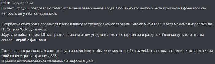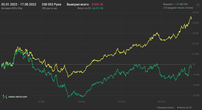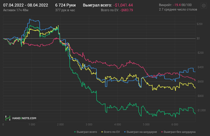 К этому моменту я работал уже бог его знает сколько без нормального выхлопа. Просто приходишь - получаешь пиздюлей - возвращаешься завтра за следующей порцией. Это угнетало. Насколько долгие периоды очень бьют по психологии. Ты просто не помнишь уже, когда выигрывал в последний раз нормально. Реально забываешь, насколько это легко - выиграть в апстрике 10 стеков. Просто сел, поймал оверсет и бахнул рега, а потом тебя фиш отбил по десятой паре, вуаля, +деньги