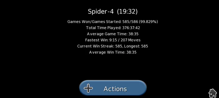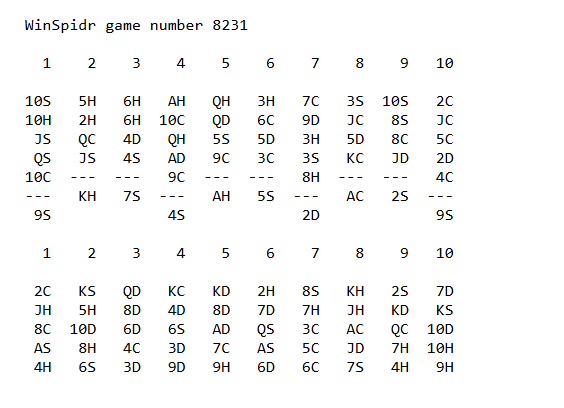 Играю я на высшем уровне сложности (четыре масти) и активно применяю возврат ходов. Моя цель - выяснить как часто удается сложить пасьянс до конца. Главное какой процент выигранных игр получается в статистике, а не лучшие очки. Поэтому возвращать ходы можно сколько угодно раз.