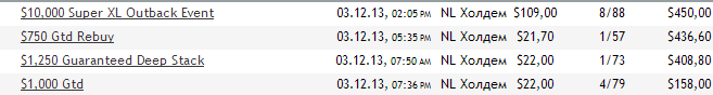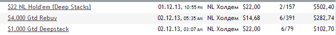 Всем привет! Пора отписаться о делах в декабре. Играли с Афонатором на пару воскресники, плюсанул немного: Фоня плюсанул вообще неплохо, но все-таки скорее не доехал.. топ4 в 10кг. Сегодня. Закончил 14тичасовую сессию из 30 турниров. Результатом доволен, хотя было пару недоездов крупных.. Еще было 4е на парти в 11+р, где 4максе шел вторым при суперкоротыше (1.5бб), проиграл чипу префлоп QK<9K. получил +485$ 6е по 25 на 888, +124$ День в хороший плюс, завтра займусь опять делами разными и в чт снова в бой!