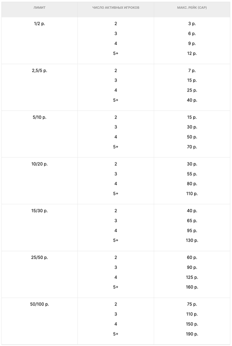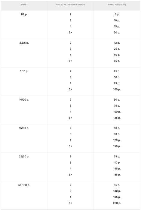 Также мы изменили уровни рейка в зависимости от количества игроков за столами на лимитах до 50/100 р. включительно. Если раньше было 2, 3 и 4+ игрока, то теперь 2, 3, 4 и 5+ игроков.