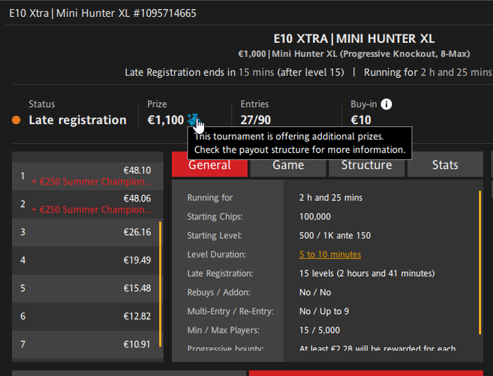 Последнее время в руме стали активно появляться Mystery Bounty многостоловые турниры, я не нашёл в их лобби показателя среднего текущего bounty за игрока, которое считается по формуле - денежный размер каждого bounty умножается на количество bounty этого размера оставшихся в турнире, а затем они складываются и мы находим общий призовой фонд bounty на текущий момент с учётом ушедшего, а это сумма делится на оставшееся количество bounty всех размеров. Такой показатель помогает принимать более адекватные решения во время игры, я думаю вам следует добавить его в лобби турнира, а лучше ещё непосредственно в информацию о показателях турнире (средний стек, блайнды и т. д.) выводящуюся на столе.