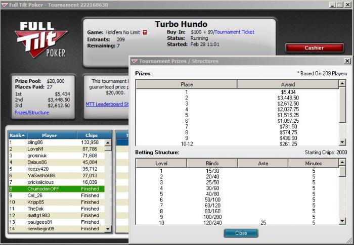 obozhemoi @ 28.2.2011очень жаль(( но двигать там на бабле ваще необходимо было, низжие призы ниочем, а скидывать он будет все кроме АА, КК точно, да и некоторые фиши, либо реги тайтеры (которые всю неделю копили на этот турик ) АК, QQ, за 1 тело до призов, очень вероятно могуть врыть но не повезло