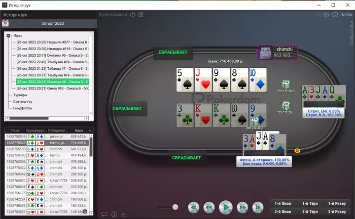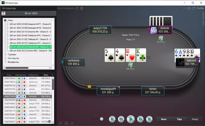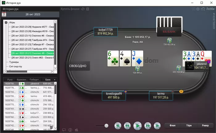 18.Честно,бог его знает что там был за екшен был,я в этот момент летел 300к и играл как обезьяна с гранатой.Тут випа имели все кроме меня.Выиграть банк 400бб почти по паре 9ток в 6карт надо постараться