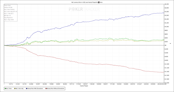 Andrei,думаю что при моей игре существуют негативные сценарии,когда такое возможно.Хоть и вероятность их крайне мала,но они есть.На рег столах я засадил в феврале 40би,даже без возможности зацепиться за лидерборд и прокатать дистанцию,думаю при нулевых и минусовых винрейтах реально и 200би сгореть.