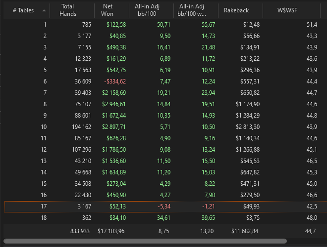 еще провел анализ статов в зависимости от количества столов. Вот говорят, что лучше катать 4-6 столов на качество, но я не совсем с этим согласен. Думаю, нужно искать что-то среднее от $/час и требуемой концентрации. 16-18 столов - это конечно хорошо, но 8 часов в таком режиме откатать сложно. 6 столов можно катать и 10-15бб/100, но теряем на рейкбеке.