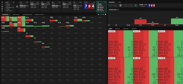 Вот скрин страты флопа. Но у солвера нет никогда колла 4бета с КК ( что показал опп). Поэтому может быть страта будет отличаться против реального диапа оппа