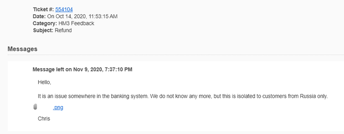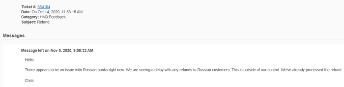 Всем привет. В октябре делал возврат средств за HM3. Деньги до сих пор не пришли, в саппорте винят российские банки. Может кто знает, что можно сделать?