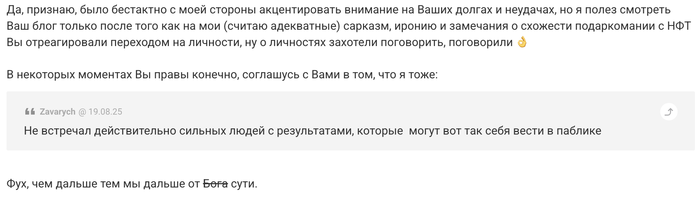 Да, признаю, было бестактно с моей стороны акцентировать внимание на Ваших долгах и неудачах, но я полез смотреть Ваш блог только после того как на мои (считаю адекватные) сарказм, иронию и замечания о схожести подаркомании с НФТ Вы отреагировали переходом на личности, ну о личностях захотели поговорить, поговорили 👌