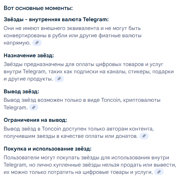 Я с 2017 года криптой пользуюсь, вроде не тупой, но ни по ссылкам, которые Вы дали, ни по гуглу, ни в нЭйросетях за два часа не нашел ни одного конкретного способа как звёзды вывести хотя бы в TON. Купить - легко, штук 5 способов вот прямо сразу в два клика, хоть за рубли, хоть за USDT,