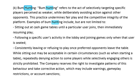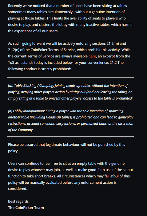 Недавно мы заметили, что многие пользователи сидят за столами - иногда за несколькими столами одновременно - без искреннего намерения играть за этими столами. Это ограничивает доступность мест для игроков, которые хотят поиграть, и загромождает лобби множеством неактивных столов, что негативно сказывается на работе всех наших пользователей. Таким образом, в дальнейшем мы будем активно применять разделы 21.2(m) и 21.2(n) Условий предоставления услуг CoinPoker, которые запрещают подобные действия. Хотя с текущими условиями предоставления услуг всегда можно ознакомиться здесь, для вашего удобства ниже приведена выдержка из Правил пользования в их нынешнем виде. 21.2. Следующие действия строго запрещены: (m) Блокирование столов / разбивка лагеря: запрещено присоединяться к общим столам без намерения играть, запрещать другим игрокам участвовать в игре, оставаясь вне игры (и не выходя из-за стола) или просто сидя за столом, чтобы помешать другим игрокам получить доступ к столу; (n) Манипуляции в лобби: Посадка игрока за другой стол с единственной целью занять его место за другим столом (включая столы для хедз-апа) запрещена и может привести к ограничениям игрового процесса, санкциям на учетную запись, приостановке действия или постоянному бану, по усмотрению Компании. Пожалуйста, будьте уверены, что данная политика не предусматривает наказания за законное поведение. Пользователи могут продолжать свободно сидеть за пустым столом с искренним желанием играть с любым, кто к ним присоединится, а также добросовестно использовать функцию "посидеть" для коротких перерывов. Все обстоятельства, которые могут противоречить настоящей политике, будут проанализированы вручную, прежде чем будут приняты какие-либо принудительные меры.