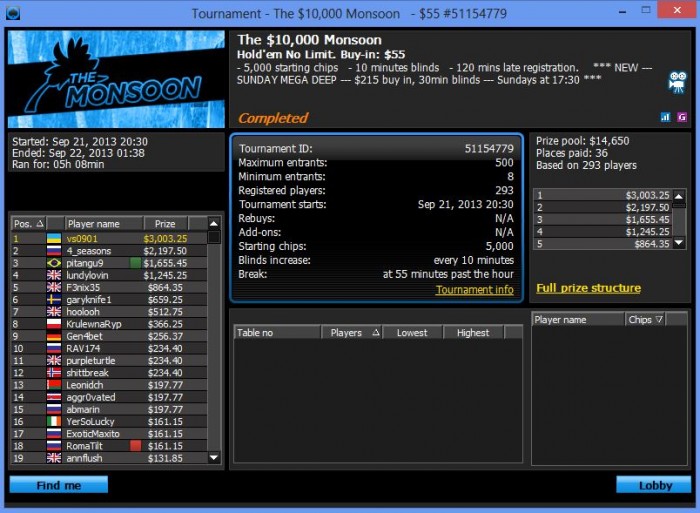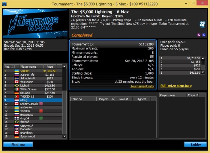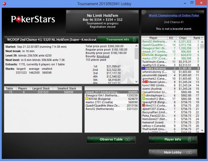 Самому понравилось, как я отыграл весь турнир, учитывая, что пришлось играть на шорт стэке большую его часть (отсюда и грандиозное количество нокаутов - первый из них заработал в топ-35). Конечно, всегда обидно, когда не затаскивается ключевая монетка на финалке, и полного удовлетворения без первого места быть не может, но хорошо, когда как в этом случае, есть позитивный заряд от хорошо отыгранного турнира.