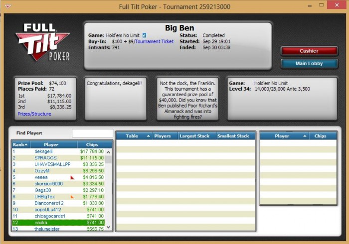 Ну а воскресенье получилось из разряда "мог бы быть большой-большой день". Вышло несколько дипранов, причём самое необычное - на всех 3х сайтах. На ФТП не хватило немного в Sunday Brawl (60 какой-то с 5КО), и совсем немного в Big Ben :