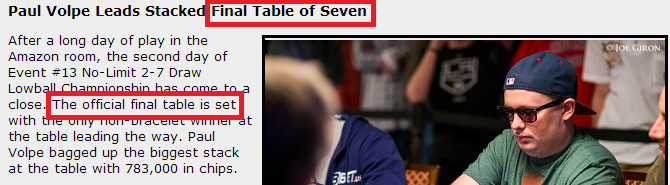 JGoose, ты несколько передергиваешь факты. Еще раз повторю, я не собираюсь оспаривать то, что это 7е место не будет считаться финальным столом. Но ты приводишь странные доводы. А если журналисты напишут, что топ 50 человек стали участниками финального стола, это станет доводом для моей победы? Эти ссылки на то, что какой то журналист называет официальной финалкой 6 макс, имеют столько же силы, как и мнение случайного человека. В правилах ВСОП написано, как формируется финальный стол- и там записано 7 макс.
