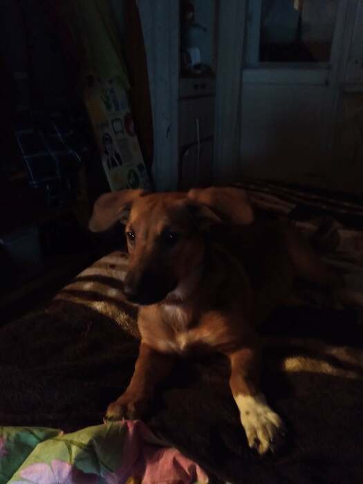 И вот мы подошли к рыжей суке Берте. Дура одичавшая, не дающая прохода коту, ворующая тапки и ночью прыгающая с диким визгом на кровать, стоит нам только пошевелиться))) Страшная, нескладная, лопоухая всехпокусака.