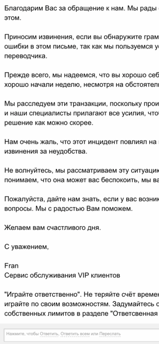 Maksimsez, Добрый день.У меня вывод с28.10.2021 не пришёл на визу.Было 3 вывода в общей сумме больше1300$.Отправлено более 20 писем со всеми выписками с лицевого счёта,за последние 2суток пришло 2 шаблонных ответа один в один.Сейчас снова написала в Vip ceрвис,с вопросом либо да ,либо нет.Была активным пользователем более 10 лет,такое чудо впервые.Пока не решится эта проблема,я просто их не кормлю,то есть не вношу депозит со 02.11.2021.И игроков на сайте стало намного меньше.Если все игроки,кто столкнулся с этой проблемой перестанут играть,может PS разрешит адекватно сложившуюся ситуацию.