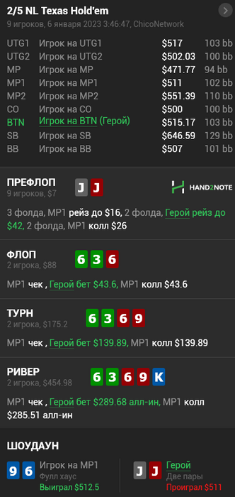 Вывод - все же ситуация не индифферентная и лучше чекнуть с JJ, а вот с QQ уже пихать. Если конечно там не фиш аля 68 на 46 и надо запихнуть в его спектр еще и 10 комб 9х разномастных.
