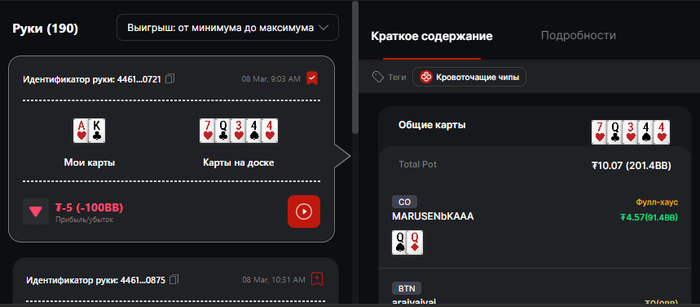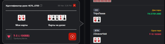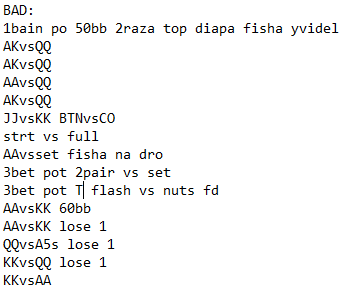 У меня все так же, друзья. Каждая сессия похожа на сон при температуре 36.9. Я настолько напараноил, что начал записывать выставления, но по итогу у них же "супер удобный и рабочий реплеер" все таки есть, в котором все будет видно наглядно, покажу небольшую выборку, потому что напряжно в нем нормально показать. После 8 часов такой катки, -10 баинов и плашки извещающей, что на автодокупку на 12 столов у меня уже нет, и не желания больше грызть всех как ебаная мышь за каждый блайнд на NL5, потому что иначе просто нет шансов выиграть, не то что easy game не дали, не дают вообще ничего добрать, собрать, поймать, доехать, отблефкетчить и не увидеть руку хуже в течении недели. Менял локацию квн (ну малоли не любят румынов они), менял количество столов от 12 до 9 (типа я не пришел две недели жестко месить рейк), играл пассивно, играл агрессивно, играл стоя, играл сессии по 3 часа, по 2, по 1.5 с перерывами, неа, не фиксится.