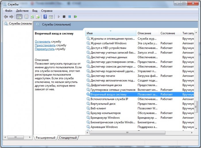 2) Проверьте, запущена ли служба Вторичный вход в систему (Secondary Logon Service). Если нет – запустите ее.