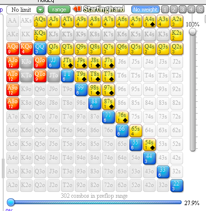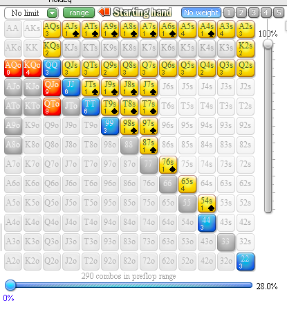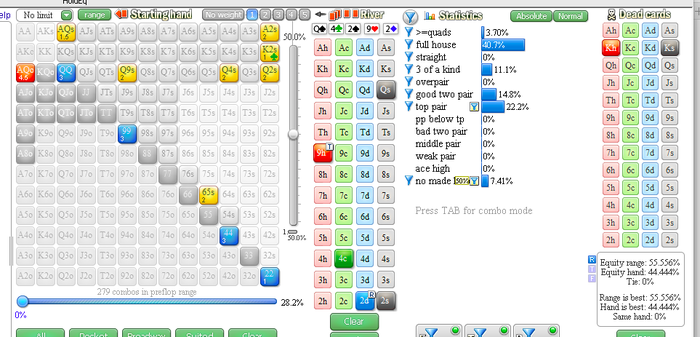 AA_KK, то что проиграл очевидно, в противном случае меня бы не волновала бы плюсовость кола. А плюсовость зависит от его диапазона на ривере. Если там только велью, то есть Д9,АА, всяческие 2х, которых на самом деле не так много, с Сб там только А2-К2. Не надо из оппа полного дебила делать и считать что он валет два будет колить с СБ на рейз от БТ. Так же добавим Каре двоек и фул четверок. Ну может быть Фул на дамах, но это крайне редко. То против этого диапазона я явно позади, но...