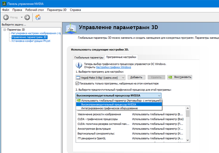 и выбираем Высокопроизводителльный процессор nvidia вместо автовыбора с интеграцией.