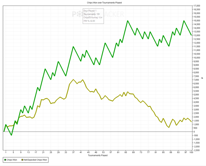 Поле было сносным, множители выпадали добротно, но раздачи шли очень плохо. К тому же, под конец стрима рум завис — всё повисло, и пришлось закончить чуть раньше, чем планировал. Как это часто бывает, первый стрим челленджа комом! =)
